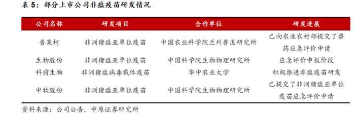 目前国内非瘟疫苗的研发路径主要为普莱柯与兰研所合作的亚单位疫苗、科前生物与华中农大合作的病毒活载体疫苗、生物股份和中牧股份与中科院合作的亚单位疫苗。其中,2025年5月普莱柯称,公司与中国农科院兰州兽医研究所合作的非洲猪瘟亚单位疫苗尚处于农业农村部组织的应急评价当中。