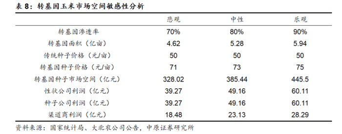 假设3:悲观情况下转基因种子使用后,性状公司、种子公司和渠道商在转基因玉米方面每亩可分别增收8.5元、8.5元和4元。