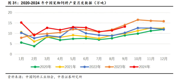 根据中国饲料工业协会发布,2024年全国工业饲料总产量31503.1万吨,同比下降2.1%。其中,宠物饲料产量159.9万吨,增长9.3%,宠物饲料在行业整体下降时迎来逆势增长。