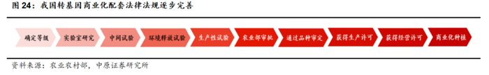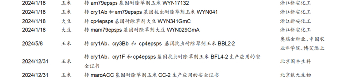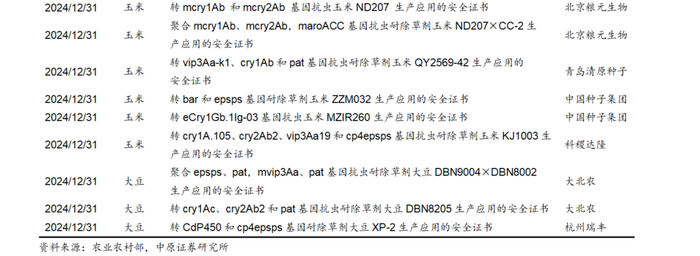2023年12月26日,根据《中华人民共和国种子法》《农业转基因生物安全管理条例》和《农作物种子生产经营许可管理办法》等有关规定,农业农村部批准国内首批转基因玉米、大豆种子生产经营许可证发放,相关生产经营许可证涉及多家种子上市公司,包括大北农、隆平高科、丰乐种业、登海种业等。这是继首批转基因玉米、大豆品种通过品种审定后,为种企面向市场销售转基因种子扫除了最后一个障碍。根据《农业转基因生物安全管理条例》,转基因品种在获得生物安全证书后,需通过品种审定获得种子生产和经营许可证,可以进入商业化生产应用,但是仍限于指定区域进行。