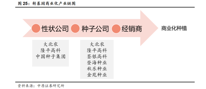 根据转基因玉米种植经验来看,一亩地给农民带来增产8%-10%,每亩地约增产80-150斤。按照玉米1.2元价格来算,就意味着在农药、化肥、人工等其它投入不变的前提下,预计每亩地就可以给农民增加96-180元的收入,其中,增收部分约20%可以提供给种业产业链。产业链可包括上游的形状公司、下游的种子公司和经销商。上游性状公司获得转基因安全证书后,和下游种企合作,制作转基因种子,再通过品种审定后方可进入商业化种植。
