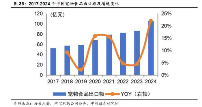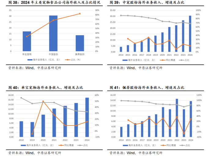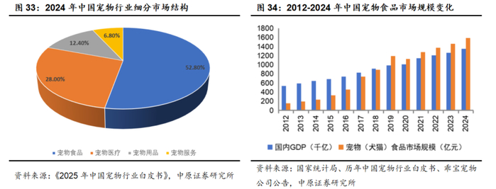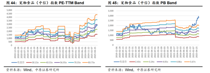 根据Euromonitor,2024年我国专业犬/猫粮渗透率为25%/43%,同比提升2.8/4.1个百分点。相比之下,2024年美国、日本的专业猫粮渗透率分别为96.9%、94.6%,专业狗粮渗透率为89.6%、92.5%。随着科学饲养观念的提升和居民生活水平的提高,专业宠粮渗透率有望持续提升,市场对宠物食品的需求将进一步释放。