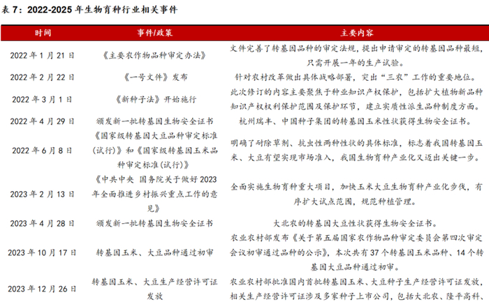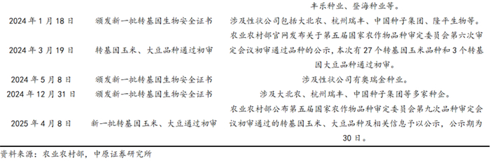 2024年3月,农业农村部首次公布27个转基因玉米品种和3个转基因大豆品种通过初审;2025年4月,农业农村部再次公布97个转基因玉米和2个转基因大豆品种通过初审。涉及大北农、登海种业、隆平高科、荃银高科、万向德农、垦丰种业等多家种业上市公司。未来,预计我国转基因玉米、大豆的品种审定将进入常态化运行,更多种企有望获得相关品种审定。