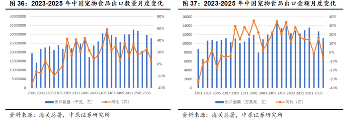 根据海关总署数,2025年4月我国宠物食品出口数量2.78万吨,同比+6.90%;1-4月累计出口11.02万吨,同比+16.17%。以美元计价,2025年4月宠物食品出口金额1.13亿美元,同比-6.12%;1-4月累计出口金额为4.54亿美元,同比+6.07%。随着国内宠物食品企业不断深化全球布局,我国宠物食品出口数据有望维持增长。