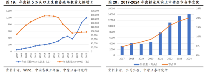 第三阶段:2016-2017年,环保政策改革加速推动养殖行业产能去化,大量中小养殖户被迫退出市场,下游集中度提升。2016年“中央一号文件”中提出,根据缓解容量调整区域养殖布局,优化畜禽养殖结构,确保农业生态环境恶化趋势总体得到遏制,治理成效明显。随后,关于畜禽养殖禁区、十三五生态环境保护规划、水污染防治法等政策密集出台。