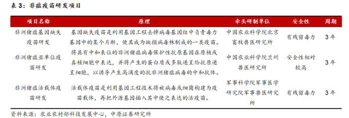 2021年12月20日,农业农村部科技发展中心关于国家重点研发计划“动物疫病综合防控关键技术研发与应用”重点专项2021年度揭榜挂帅项目安排进行了公示,4个项目中包含有非洲猪瘟基因缺失疫苗研发、非洲猪瘟亚单位疫苗研发、非洲猪瘟活载体疫苗研发。我国是生猪养殖和销售大国,由于潜在市场空间较大,非瘟疫苗项目的研发和上市进展备受市场关注。