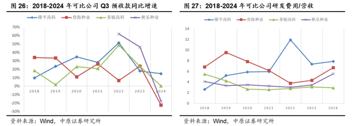 从种业可比上市公司来看,2024年隆平高科三季度预收账款维持同比正增长,根据历史经验,三季度预收款增速通常与下一销售季的收入增速维持一致;从研发投入来看,隆平高科、登海种业、秋乐种业研发费用占营收比例同比提升。
