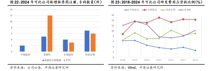 2024年,普莱柯、科前生物获得新兽药注册数量和专利数量居前。从研发费用来看,生物股份研发费用占总营收比例相对较高。
