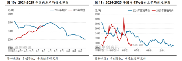 据卓创资讯统计,5月23日-5月29日全国玉米周度均价是2302.22元/吨,环比下跌7.82元/吨,跌幅0.34%;43%蛋白豆粕全国平均价格2945元/吨,环比下跌7元/吨,跌幅0.24%。
