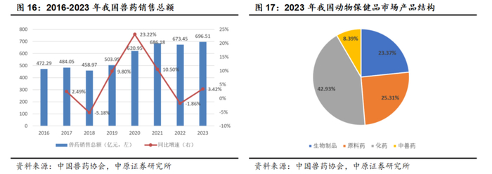 从行业结构来看,国内动物保健品市场产品结构和国外动物保健品市场相似,均以化药和生物制品为主。2023年,我国生物制品市场规模162.76亿元,同比下降1.76%;原料药市场规模176.26亿元,同比增长1.87%;化药制剂市场规模299.02亿元,同比增长5.54%;中兽药市场规模58.47亿元,同比增长13.69%。