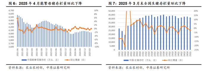 根据农业农村部数据,2025年4月末全国能繁母猪存栏量4038万头,同比+1.30%,环比-0.02%,仍高于正常保有量(调整后)138万头;2025年3月末全国生猪存栏4.17亿头,同比增长2.16%,同比由降转增,环比下降2.37%,环比由增转降。预计2025年后续能繁产能仍以小幅波动为主。