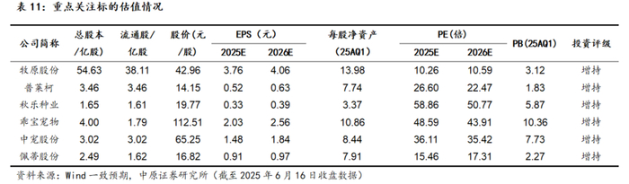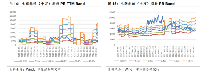 行业展望:1、生猪养殖:从产能来看,能繁母猪存栏量和全部生猪存栏量处于较高水平,2025年1-4月仔猪供应量呈现增长态势,预计下半年市场生猪供应仍较为充足。从需求端来看,加征美国猪肉关税这一举措或导致进口冻品数量下降,侧面推动国内屠宰量增加,叠加下半年将进入猪肉传统消费旺季,预计2025年下半年行业或进入供需双增的局面。随着宏观调控下产能逐步去化至合理水平,市场供需关系有望进一步改善,行业龙头将率先受益。2、动保:从短期来看,畜禽产能的高位运行导致动保产品需求饱满,随着畜禽养殖行业进入上行周期,动保行业业绩有望受到支撑;从中期来看,非瘟疫苗上市后动保行业市场规模将打开增量空间;从长期来看,下游畜禽养殖行业规模化提升将持续推动动保产品需求的增长。3、种业:近年来行业法规和配套政策密集出台,生物育种商业化政策明朗。种植业估值处于历史相对低位,前期负面情绪释放完成,面对生物育种潜在市场空间,当前种业板块具备明显投资价值。2024年是我国生物育种元年,前期通过品种初审的种企已经获得生产经营许可证书,相关上市公司有望受益于行业集中度和利润率的双重提升。4、宠物食品:受益于人口结构变化和居民生活水平提升,中国宠物食品行业市场规模仍有较大增长空间。根据销售数据统计,我国宠物食品行业呈现出线上占比提升和国产替代深化的趋势。参照海外成熟宠物市场,随着我国宠物食品行业国产替代的加深,相关上市公司市场份额仍有较大增长空间。