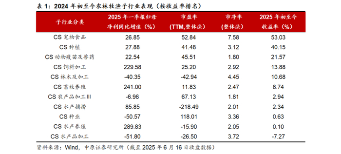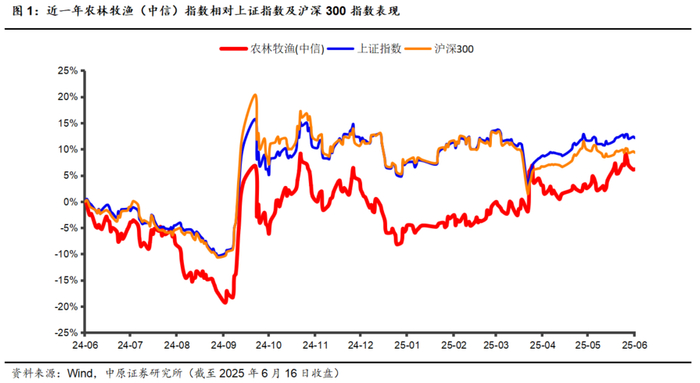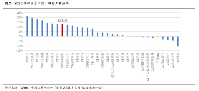 2025年初-6月16日,农林牧渔指数(中信)绝对收益率为+12.81%,在中信一级30个行业中排第8位,跑赢沪深300指数14.5个百分点。