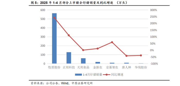 此外,头部猪企仔猪销量加速。2025年1-4月,跟踪7家上市猪企合计销售仔猪795.38万头,同比增长139.2%;其中,牧原股份累计销售仔猪562.9万头,同比增长241.8%。仔猪销量同比大幅增长,预计将带动2025年下半年商品猪出栏量的增加,叠加压栏导致均重高企,预计下半年行业生猪供应充足。