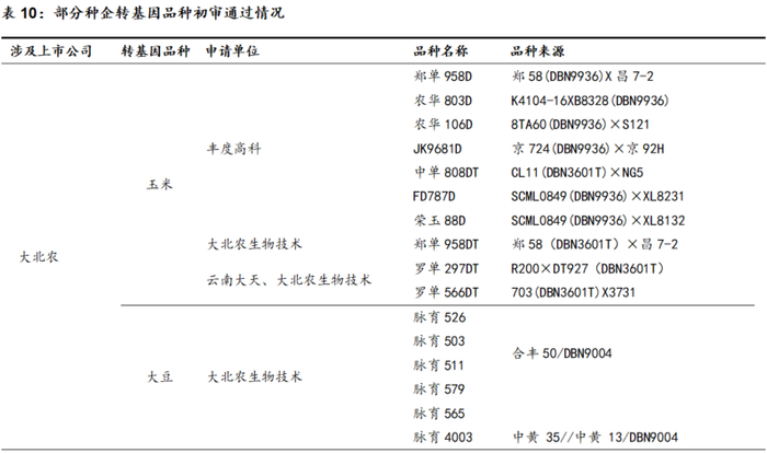 从性状获批来看,隆平高科及其参股公司(杭州瑞丰)、大北农、中国种子集团转基因性状获批数量较多,分别为10、8、5个;从品种初审通过来看,大北农、隆平高科、登海种业、荃银高科转基因玉米、大豆品种初审通过数量较多。随着转基因性状和品种的陆续通过,行业渗透率有望持续提升。