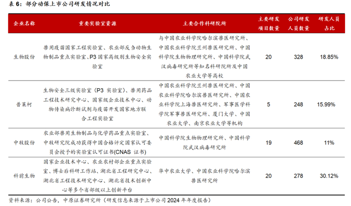 从研发综合实力来看,根据上市公司年报披露,四家公司都同行业技术领先的科研院所进行协同合作。其中,2023年生物股份、科前生物主要研发项目数量居前,生物股份、普莱柯拥有P3实验室,中牧股份研发人员数量较为突出。