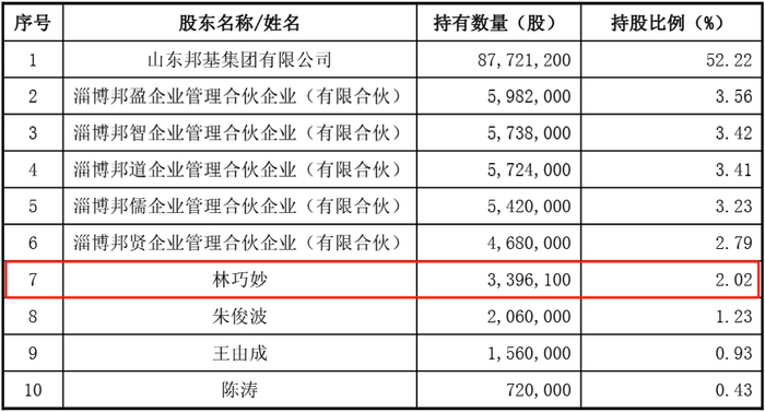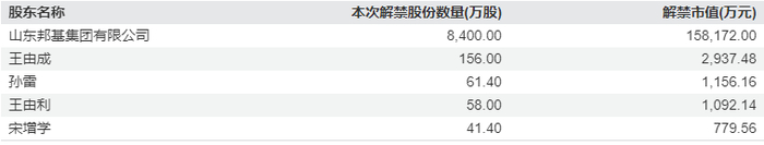 此次解禁股东包括控股股东山东邦基集团有限公司(以下简称“邦基集团”),实控人及其一致行动人王由成、王由利兄弟,以及自然人孙雷和宋增学。