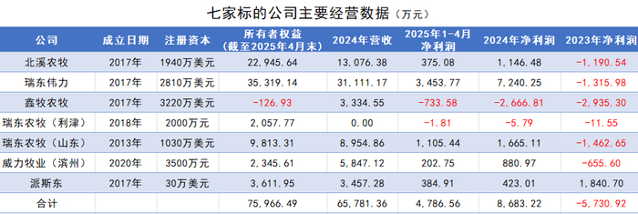 公告未披露这7家公司的养猪规模,但从营收规模来看,与行业龙头差距甚远。据界面新闻统计,7家公司2024年营业收入共6.58亿元。