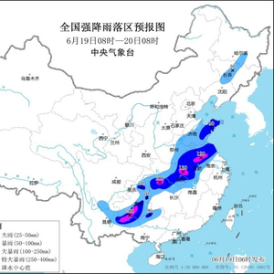 预计,6月19日08时至20日08时,黄淮中东部、江淮、江汉、重庆东部、湖南西部和北部、江西北部、贵州东部和南部、云南东部、广西北部等地部分地区有大到暴雨,其中,安徽中北部、江苏中部、湖北东北部和西南部、湖南北部、贵州南部、广西北部等地部分地区有大暴雨,贵州西南部等地局地特大暴雨(250~280毫米)。上述部分地区伴有短时强降水(最大小时降雨量20~50毫米,局地可超过80毫米),局地有雷暴大风等强对流天气。中央气象台6月19日06时继续发布暴雨黄色预警。