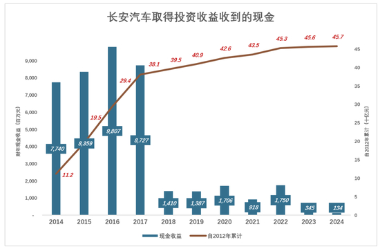 2012年-2024年,长安汽车共计获得现金收益457亿。