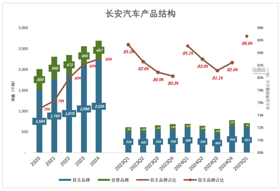 紧随上汽集团的是长安汽车:2024年自有品牌新能源车销量为72.8万辆,约占自有品牌总销量的32.6%。其中,2024年Q4自有品牌新能源车占比达43.4%。