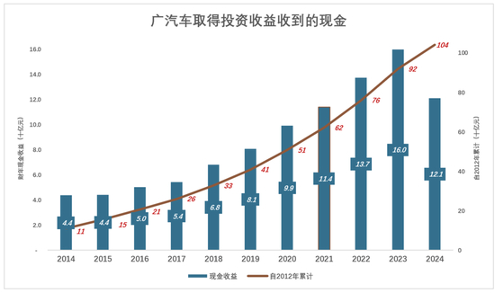 2012年-2024年,广汽共计获得现金收益1040亿,相当于长安的227%!