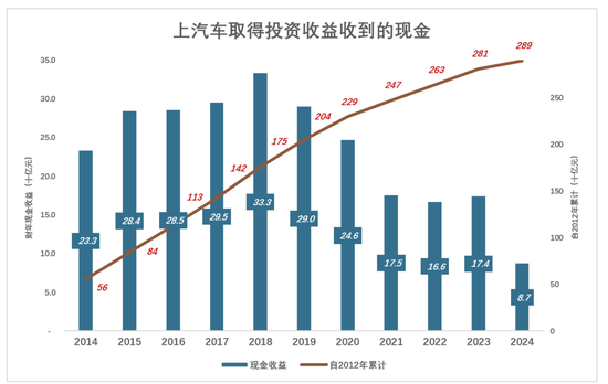 2012年-2024年,上汽共计获得现金收益2893亿,相当于长安的633%。