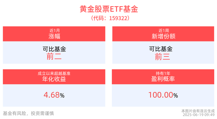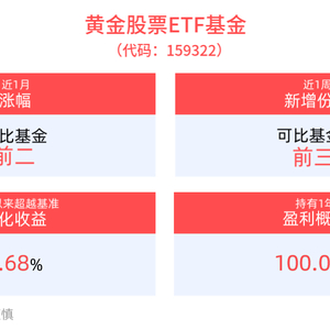 份额方面,黄金股票ETF基金近1周份额增长600.00万份,实现显著增长。截至6月18日,黄金股票ETF基金近1年净值上涨23.80%。