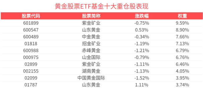 数据显示,截至2025年5月30日,中证沪深港黄金产业股票指数(931238)前十大权重股分别为山东黄金(600547)、紫金矿业(601899)、赤峰黄金(600988)、中金黄金(600489)、山金国际(000975)、招金矿业(01818)、山东黄金(01787)、湖南黄金(002155)、老铺黄金(06181)、紫金矿业(02899),前十大权重股合计占比68.91%。