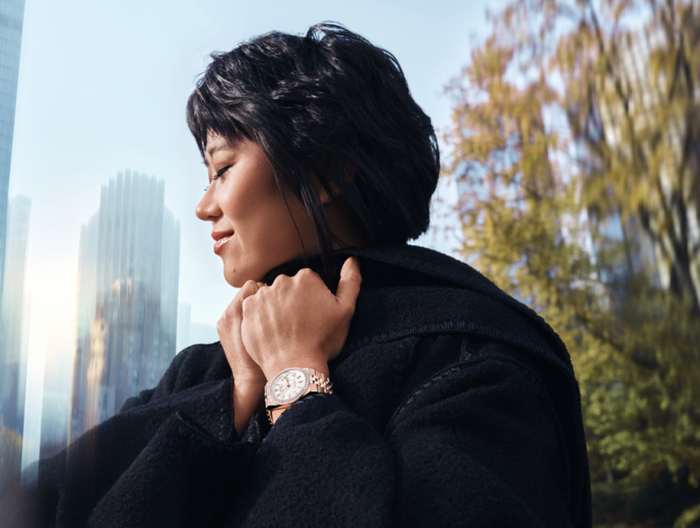 王羽佳佩戴着18K永恒玫瑰金款陆使型 36腕表搭配镶钻外圈
