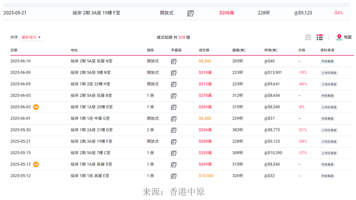 据香港中原网信息,截至6月17日,缇岸项目的不少二手房源价格跌幅超过50%。如5月21日成交的一套2期3A座19楼的房源,面积为228平方呎,成交价为208万港元,较买入时的价格下跌约54%。