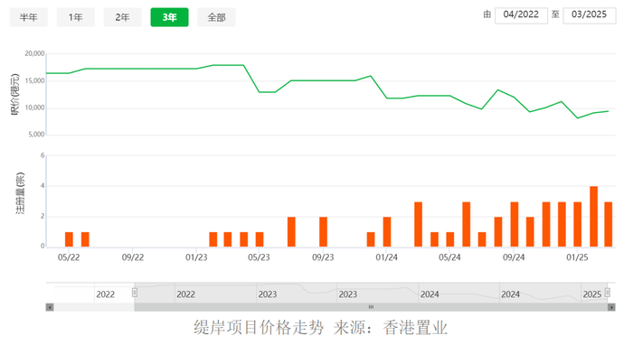 香港置业数据显示,缇岸项目在2022年6月的成交单价为1.73万港元/平方呎,而今年3月的价格为9402港元/平方呎,回调幅度约45.7%。