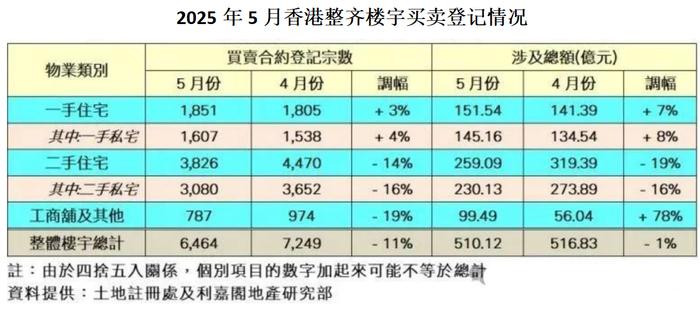 香港土地注册处数据显示,5月所有楼宇买卖合约数为6442宗,同比和环比分别下降12.5%及10.9%,宗数回落至今年2月以来的近3个月低位;楼宇买卖合约总值为498.5亿港元,较去年5月下降20.7%,较今年4月微降0.5%。