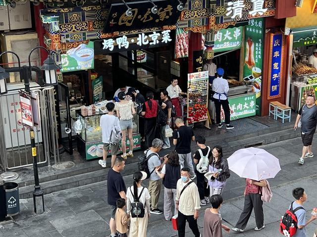 周日上午10点多,前门大栅栏紫光园饭店门前的顾客队伍折了几道弯,其中不乏拖着行李箱的游客。“傍晚就坐高铁回了,特意再来吃顿烤鸭,顺便打包两大兜子奶皮子酸奶!”来自沈阳的小陈兴奋地说。该店店员告诉记者:“酸奶太火了,一天卖1万多杯是常事!”