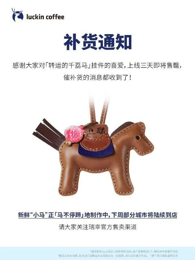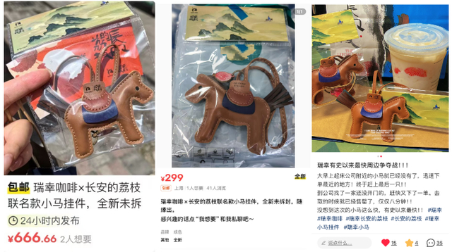 瑞幸果蔬茶配套周边“努力鱼”和“聪明鱼”发条玩具上线约50万件,两天即售罄。据记者在闲鱼二手平台上观察,其转卖溢价超原价3倍。而荔枝冰萃系列的配套周边千荔马挂件被网友称为“转运小马”,首批三天基本售罄,热度几乎等同于潮玩品牌Labubu。目前,瑞幸发布补货通知,表示正在制作新的小马,下周将在部分城市门店上线。