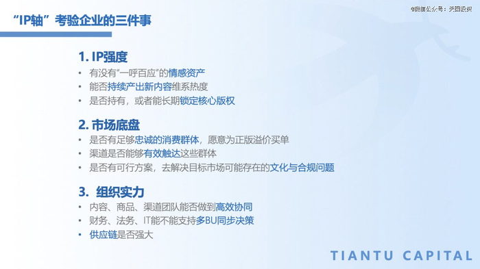 1.IP强度。有没有“一呼百应”的情感资产;能否持续产出新内容维系热度;是否持有,或者能长期锁定核心版权。因为版权不稳而为他人做嫁衣的例子太多了,不仅仅是娱乐产业,这种事情各行各业都存在。