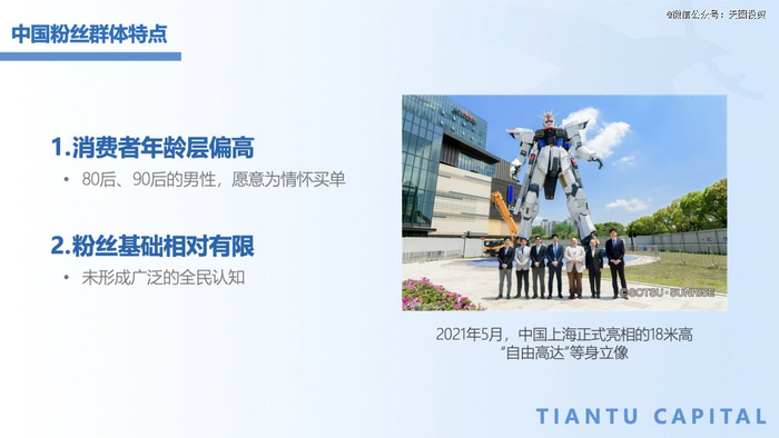 1. 中国的消费者是年龄层偏高,核心消费者主要是80后、90后的男性,他们小时候通过盗版碟片或动画频道接触到《高达》,长大后有了一定消费力,愿意为情怀买单。