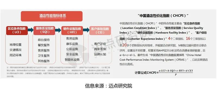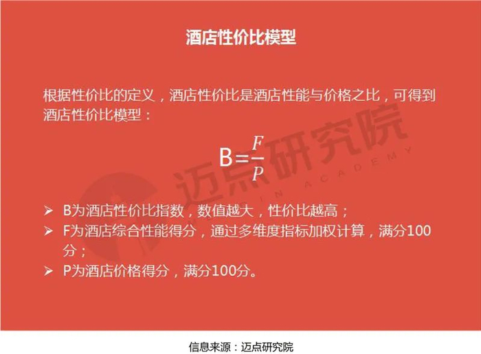 酒店性价比模型及中国酒店性价比指数:酒店性价比(B)是酒店性能(F)与价格(P)之比。中国酒店性价比指数的综合性能主要由区位条件、服务质量、硬件设施、客户体验等4个二级指标、16个三级指标以及20多个四级指标共同组成,其中a为区位条件指数的权重;b为服务质量指数的权重;c硬件设施指数的权重;d为客户体验指数的权重。权重采用AHP层次分析法结合消费者调研数据,且a+b+c+d=1。P为酒店价格分值。最终生成“中国酒店性价比指数监测系统”,以此反映酒店性价比高低。