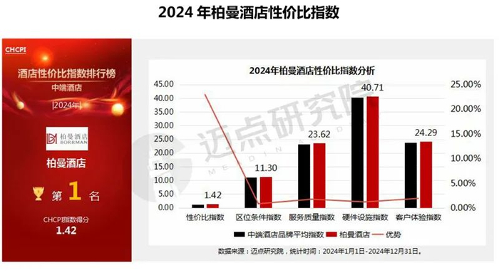 中端酒店品牌案例分析:柏曼酒店位列2024年中端酒店性价比指数榜单第一名。柏曼酒店在客房设施、公区设施等硬件配备及数字化程度上,都超过行业平均水平,能为宾客提供相对舒适、便捷的硬件环境。此外,柏曼酒店在房价上也具有极大的竞争力,在保证服务与设施质量的前提下,有力地提升了酒店的性价比。