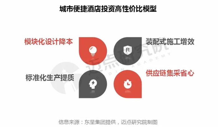 城市便捷酒店的高性价比表现:聚焦大众市场,为用户带来高性价比体验,为投资人带来高性价比回报。从消费者角度来看,东呈城市便捷酒店以满足客户刚性需求为出发点,设计“六维睡眠文化”打造高性价比体验,让消费者享受到中档入门级的住宿品质。从投资人角度来看,东呈城市便捷酒店4.0通过投资高性价比模型,进一步将单房造价下探至6.7万元起,显著低于同档次竞品。