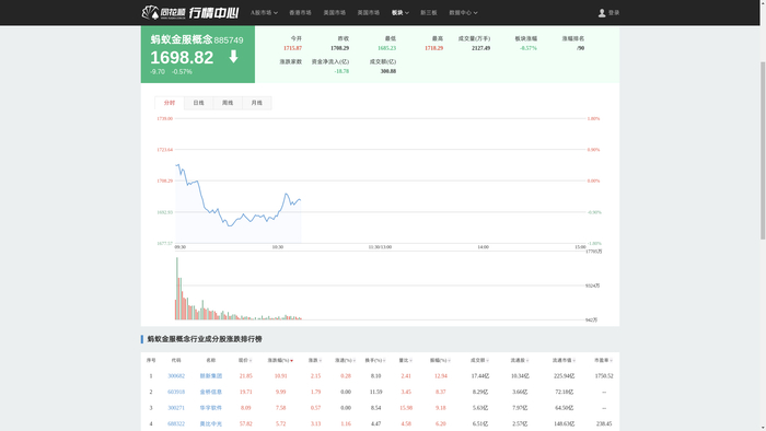 蚂蚁金服概念相关概念股如下:朗新集团:蚂蚁集团是间接大股东,共同成立子公司,聚焦软件开发与智能终端业务。华峰超纤:子公司威富通在支付场景解决方案领域与蚂蚁集团有长期合作。奥比中光:合作推出3D刷脸支付设备,并在交易领域深化合作。恒生电子:蚂蚁金服间接参股,是金融科技合作伙伴,主营计算机软件与系统集成。
