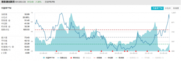 这样看来,这一轮港股创新药的上涨核心驱动力在于政策面的边际改善以及板块自身的业绩回暖,那么外部不确定性的冲击就很难对行情产生根本性的改变。同时从估值水平来看,即便是经历了3-5月份的大涨之后,无论是横向还是纵向,港股创新药板块依旧处于性价比较高的区间之内。以港股通创新药指数为例,目前指数的市盈率仅为32.89倍,处于近三年以来历史分位数的23.08%,低位特征明显。