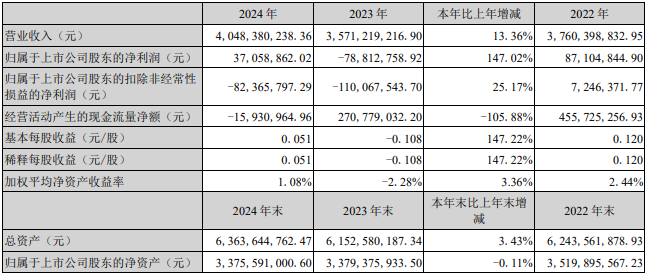 公司报告期内营业总收入为40.48亿元,同比增长13.36%;归属于上市公司股东的净利润为3705.89万元,去年同期为-7881.28万元;归属于上市公司股东的扣除非经常性损益的净利润为-8236.58万元,去年同期为-1.10亿元;经营活动产生的现金流量净额为-1593.10万元。