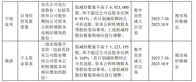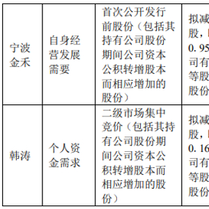 持公司股份6,923,000股(占公司总股本比例0.951%)的公司股东宁波金禾企业管理咨询有限公司计划在自减持计划公告之日起十五个交易日后的三个月内以集中竞价或大宗交易方式减持公司股份不超过6,923,000股(不超过公司总股本比例0.951%)。