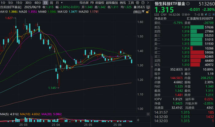 截至6月19日14:32,恒生科技ETF基金(513260)标的指数前十大成分股全数回调:美团、京东、快手跌超3%,腾讯控股、阿里巴巴、比亚迪股份跌超2%,小米集团、中芯国际、理想汽车跌超1%,网易微跌。