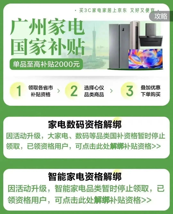 广东的广州、佛山、湛江等地已无法领取智能家电家居等类别补贴。