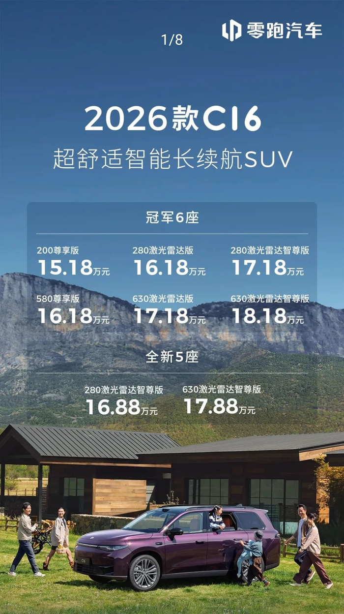 6月18日,零跑汽车宣布旗下旗下2026款零跑C16正式上市,新车共推出冠军6座和全新5座双版本共计8款车型,售价区间为15.18-18.18万元。其中,6座版共推出6款车型,售价为15.18-18.18万元;全新五座版车型共推出2款车型,售为价16.88-17.88万元。作为对比,2024款零跑C16售价为15.58-18.98万元。