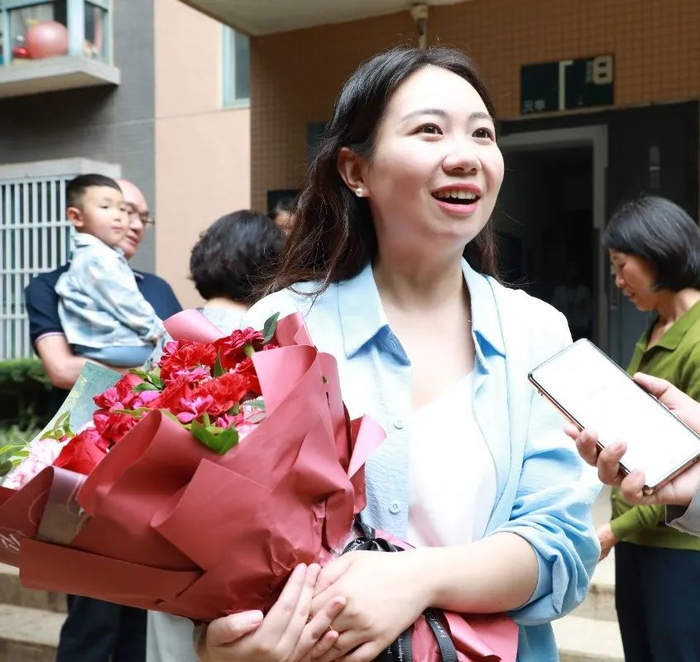 “送喜报”队伍抬着牌匾,举着“热烈祝贺郑健同志荣获二级表彰”横幅,敲锣打鼓来到郑健家楼下,吸引众多社区居民前来观看。