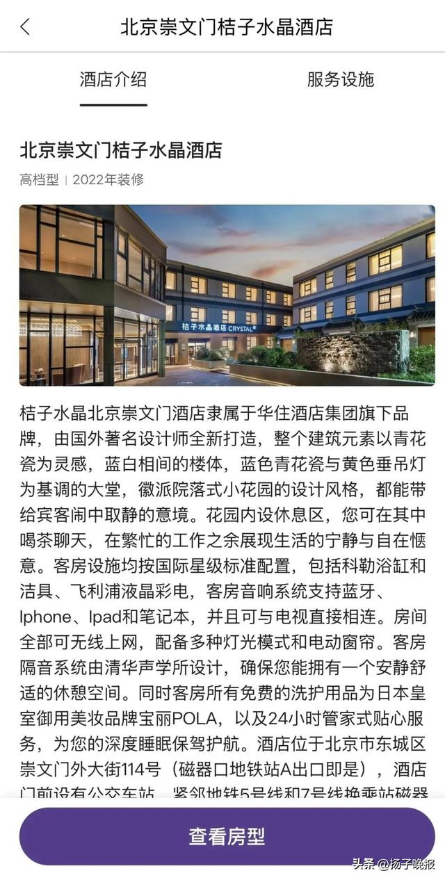 据介绍,桔子水晶北京崇文门酒店隶属于华住酒店集团旗下品牌,属于高档型酒店,2022年装修。