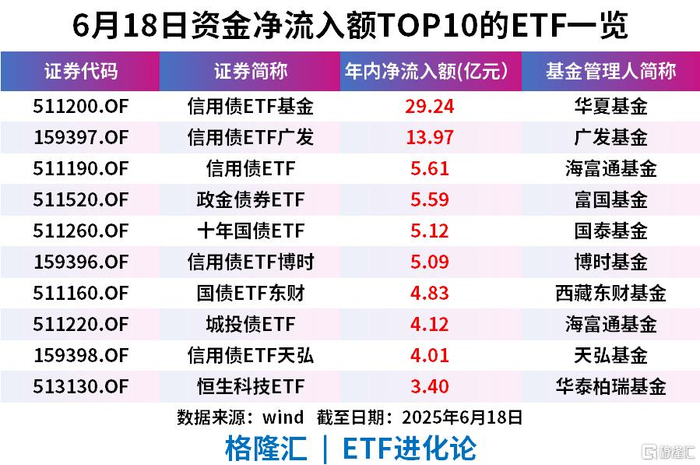 债券ETF近期强势吸金,6月18日ETF净流入前十榜单中,前8只均为债券型ETF。信用债ETF基金吸金超29.24亿元,信用债ETF广发吸金13.97亿元。